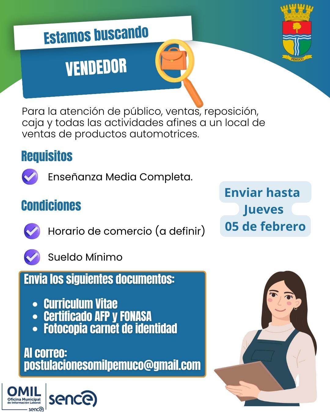 Estamos buscando vendedor para la atención de público, ventas, reposición, caja y todas las actividades afines a un local de ventas de productos automotrices.